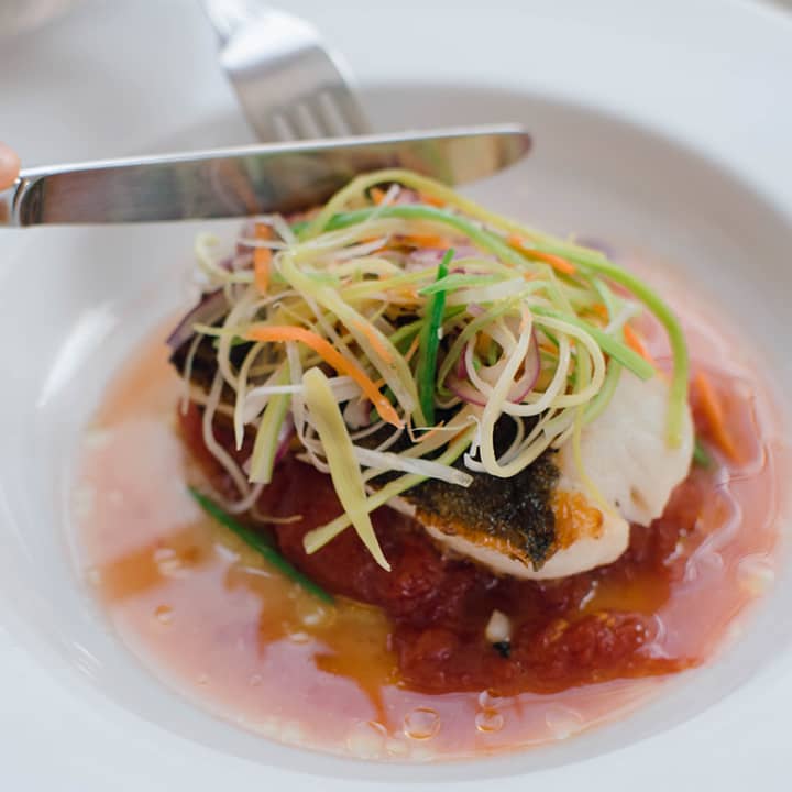 - Bacalao a la Plancha con Tomate Confitado y verduras al revés