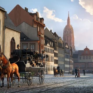 Frankfurt im 19. Jahrhundert: Mit diesen Tickets für das TimeRide Frankfurt erwartet Dich eine Virtual-Reality-Reise in die Vergangenheit der Stadt. Bei Deiner Zeitreise durch die Geschichte der heutigen Mainmetropole tauchst Du in das bunte Treiben vor Ort ein und siehst, wie das Leben hier noch vor zwei Jahrhunderten aussah. Setze Dein Virtual-Reality-Headset auf und höre das Kreischen der Möwen, das Klappern von Pferdekutschen und den Trubel des Alltags in einer lebhaften Stadt aus dem 19. Jahrhundert.