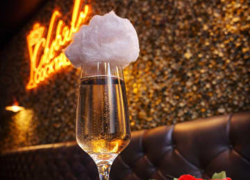 🍾 Añade un toque de chispa a tu velada con este dulce capricho, con Prosecco, Amargo de Chocolate, Fresa y una guarnición de Algodón de Azúcar