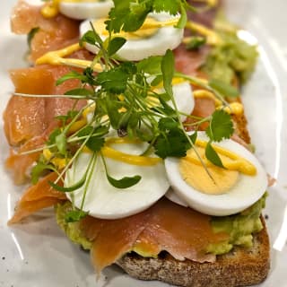 - Tosta con salmón, huevo y aguacate